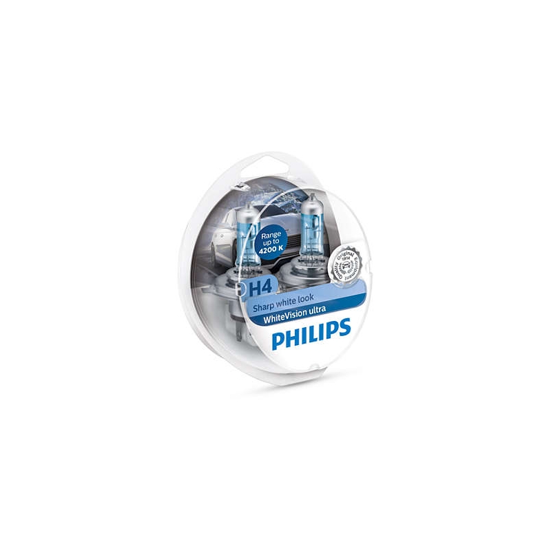 Le lampade Philips White Vision Ultra H4 aggiungono un look bianco xenon ai fari dell'auto. Offrono maggiore luminosità e intensità di luce bianca fino a 4200 Kelvin